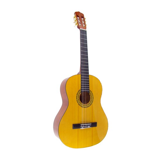 Κλασσική κιθάρα μεγέθους 4/4 με καπάκι από έλατο και ταστιέρα hardwood. Διαθέτει επίχρυσα κλειδιά και είναι σε χρώμα καρυδιά. Ιδανική για το ξεκίνημα στον χώρο της κιθάρας. Χρώμα φυσικό. Όμορφος και απαλός ήχος.