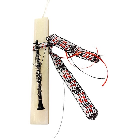 Χειροποίητη πασχαλινή λαμπάδα με μινιατούρα κλαρινέτου. Διαλέξτε από την μεγαλύτερη ποικιλία πανελλαδικά σε λαμπάδες με μουσικό θέμα, και βρείτε αυτή που σας ταιριάζει.Η λαμπάδα αυτή είναι διακοσμημένη με ασπρόμαυρο ύφασμα και κορδέλες. Συμπεριλαμβάνεται η συσκευασία δώρου.