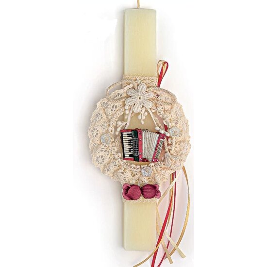 Για τον νονό που ψάχνει την πιο ιδιαίτερη λαμπάδα, θα την βρει μόνο στο Musicmarket. Χειροποίητη πασχαλινή λαμπάδα με πλακέ αρωματικό κερί, διακοσμημένη με κορδέλες, κέντημα και διακοσμητική μινιατούρα ακορντεόν.