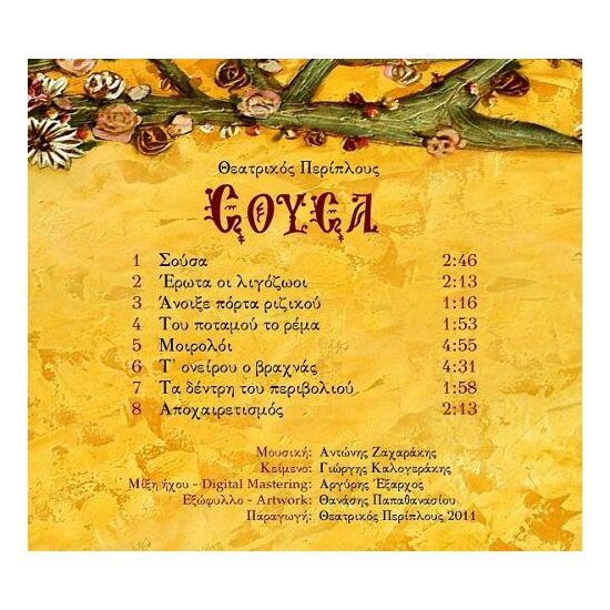 'ΣΟΥΣΑ' 1 «Σούσα» 2 «Έρωτα οι λιγόζωοι» 3 «Άνοιξε πόρτα ριζικού» 4 «Του ποταμού το ρέμα» 5 «Μοιρολόϊ» 6 «Τ' ονείρου ο βραχνάς» 7 «Τα δέντρη του περιβολιού» 8 «Αποχαιρετισμός» Θεατρικός Περίπλους 2011 Κείμενο: Γιώργης Καλογεράκης Σκηνοθεσία: Θωμάς Καντιφές Μουσική: Αντώνης Ζαχαράκης |