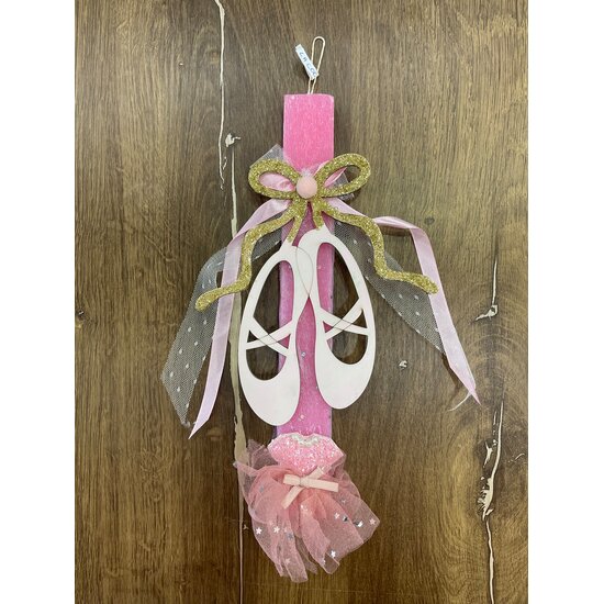 Χειροποίητη πασχαλινή λαμπάδα με πλακέ αρωματικό κερί επάνω σε ξύλινη εκτυπωμένη βάση, διακοσμημένη με φιογκάκια, ξύλινο διακοσμητικό πουέντ και χειροποίητο φόρεμα μπαλαρίνας από γκλίτερ και τούλι.Η συσκευασία δώρου περιλάμβάνει χαρτί αφής, εορταστική τσάντα και κορδέλα.