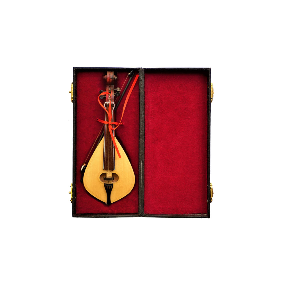Ξύλινη μινιατούρα κρητικής λύρας, χρωματισμένη.  Συνοδεύεται από μεταλλικό βιδωτό νίκελ σταντ, δοξάρι και από σκληρή θήκη με κόκκινο βελούδο.
