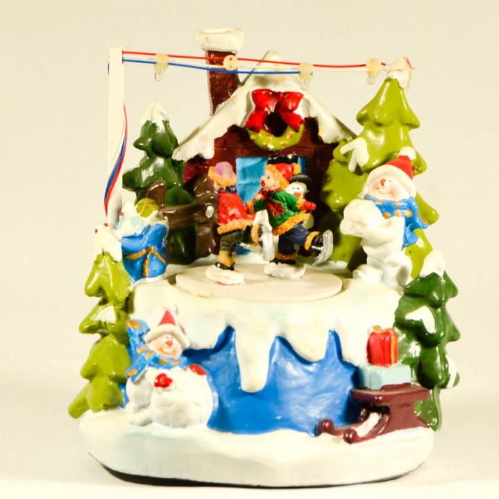 Χριστουγεννιάτικο διακοσμητικό με χιονάνθρωπο και παιδάκια που κάνουν πατινάζ. Είναι φωτιζόμενο, παίζει μουσική καθώς κινούνται και τα παιδάκια. Δουλεύει με μπαταρίες 4 x AA. Το μέγεθός του είναι μήκος 12 εκατοστά και ύψος 14 εκατοστά.