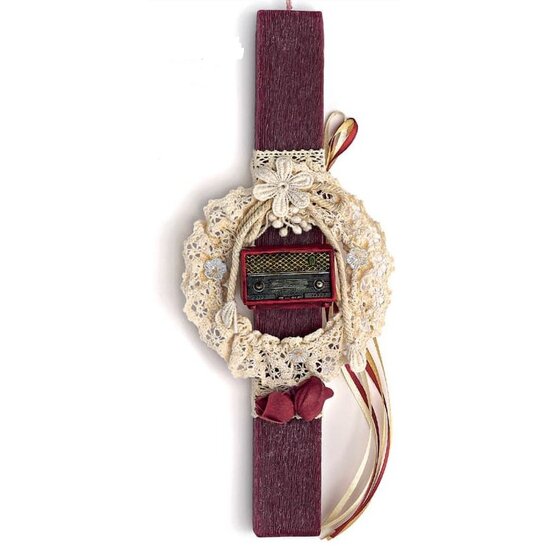 Χειροποίητη πασχαλινή λαμπάδα με πλακέ αρωματικό κερί, διακοσμημένη με κορδέλες, κέντημα και διακοσμητική μινιατούρα ραδιοφώνου.Πρωτότυπες λαμπάδες με μουσικά όργανα στις καλύτερες τιμές της αγοράς.