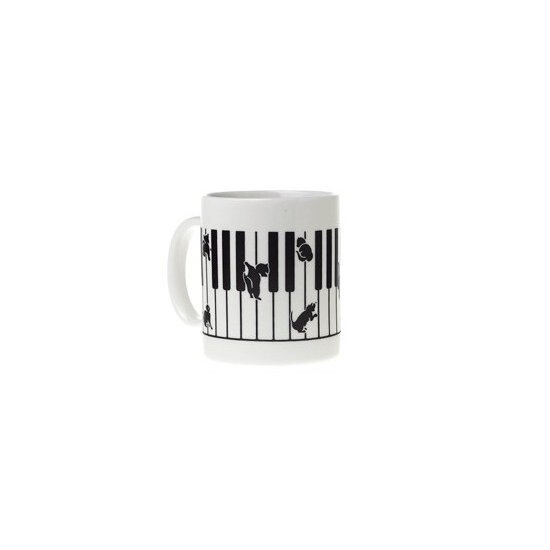 Η κούπα αυτή είναι σχεδιασμένη για να ικανοποιήσει όλους όσους αγαπούν την μουσική και τα ζώα. Κούπα άσπρη με μαύρα πλήκτρα πιάνου και γατούλες που σκαρφαλώνουν σε αυτά.