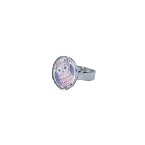 Δαχτυλίδι στρογγυλό με κουκουβάγια σε παρτιτούρα. Η διάμετρός του είναι 2 εκατοστά και αυξομειώνεται το μέγεθος για να ταιριάζει σε όλα τα δάχτυλα.