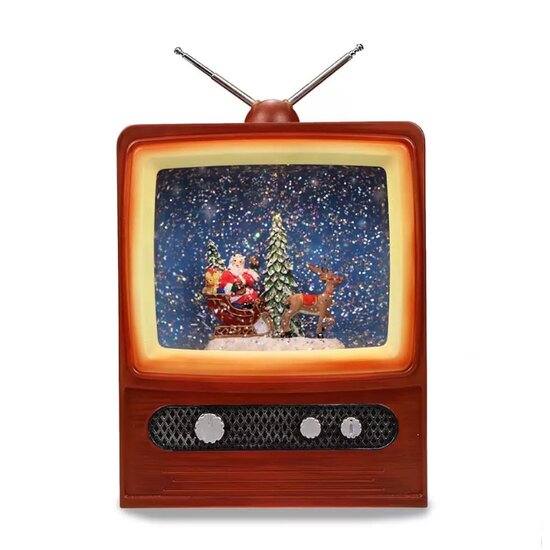 Συμπληρώστε τη γιορτινή ατμόσφαιρα με ένα εντυπωσιακό φωτισμένο διακοσμητικό που θυμίζει παλιά τηλεόραση, δημιουργώντας ένα χριστουγεννιάτικό σκηνικό χάρη στο μηχανισμό που διαθέτει, στροβιλίζει τις αστραφτερές νιφάδες, παράλληλα παίζει διάφορες Χριστουγεννιάτικες μελωδίες.Λειτουργεί με βύσμα USB ή 3 μπαταρίες ΑΑ (δεν περιέχονται). Διαστάσεις: 23 x 15.5 x 7 cm.