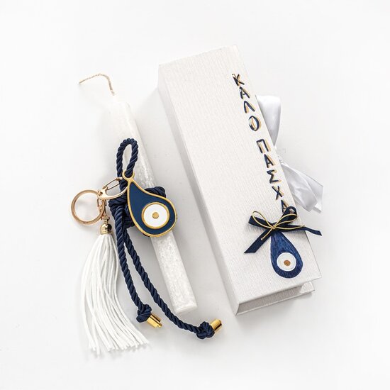 Το πασχαλινό δωράκι περιλαμβάνει: χάρτινο κουτάκι λευκό ζωγραφιστό με επένδυση σατέν και τη λαμπάδα διακοσμημένη με μεταλλικό ματάκι δάκρυ και φουντίτσα μπρελόκ.