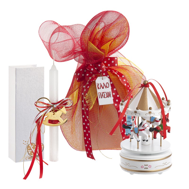 Πασχαλινή λαμπάδα με θέμα το καρουζελ. Το πασχαλινό δωράκι περιλαμβάνει: Ξύλινο λευκό - χρυσό καρουζελ και χάρτινο κουτάκι με την λαμπάδα η οποία είναι διακοσμημένη με χρυσό μεταλλικό μοτίφ αλογάκι .
