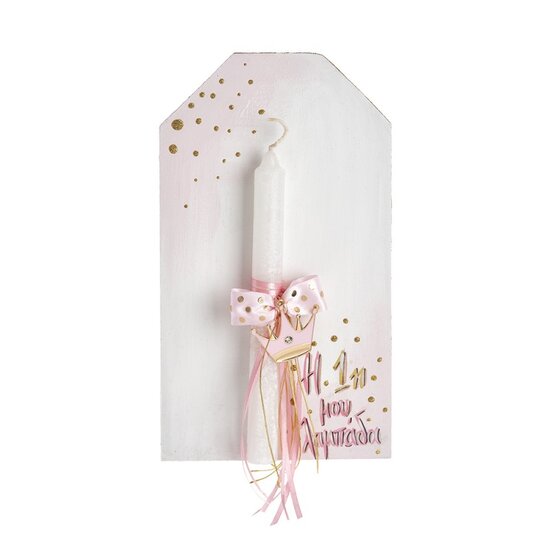 2) τη λαμπάδα η οποία είναι διακοσμημένη με κορδέλα print πουά ροζ και μεταλλικό μοτίφ κορώνα ροζ -χρυσό .