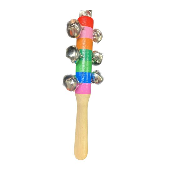Δέκα Κουδουνάκια σε Ξύλινη πολύχρωμη Λαβή κατάλληλα για την μουσική προπαιδεία αλλά και για μουσικά παιχνίδια. Το μέγεθός τους είναι 19 εκατοστά.