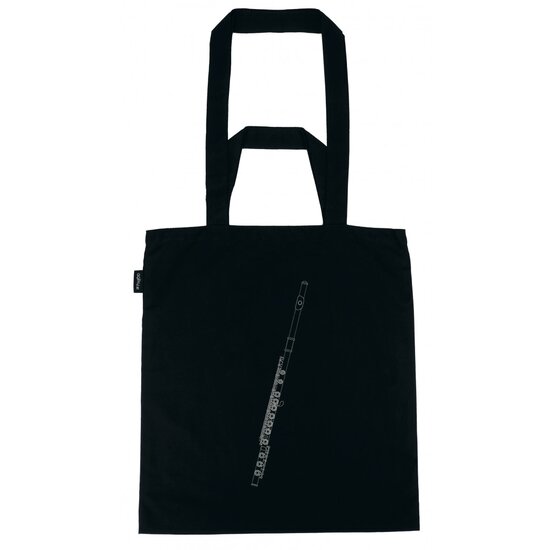Μαύρη τσάντα υφασμάτινη με ασημί φλάουτο τυπωμένο και από τις δύο πλευρές. Με μακρύ και κοντό χερούλι για να την κρατάτε όπως σας βολεύει. Το μέγεθός της είναι 37 χ 40 εκατοστά.