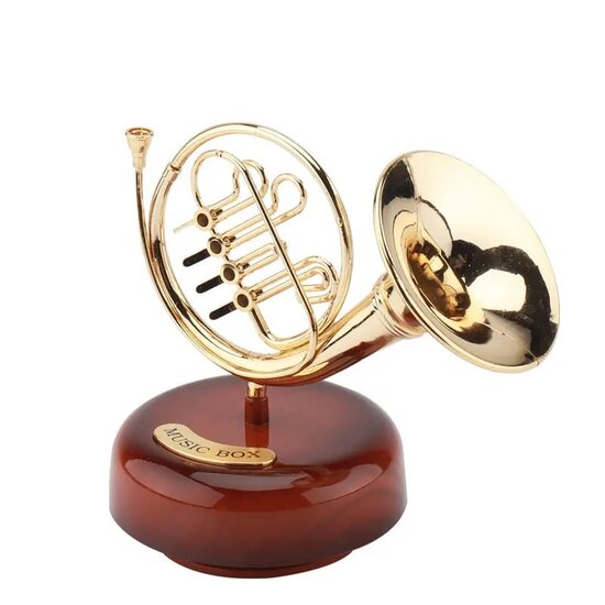 Μουσικό κουτί Γαλλικό Κόρνο. Το υλικό είναι πλαστικό και το μέγεθος είναι 15 x 14 εκατοστά. Απλά κουρδίστε το και εκείνο θα πειρστρέφεται στην μελωδία της μουσικής.